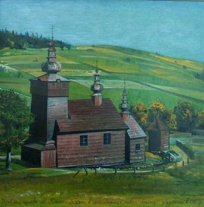 Церква Cвятих Косми і Дам’яна побудована в 1787 р., с. Баніца, Горлицький регіон. Олія на дереві, (1988)